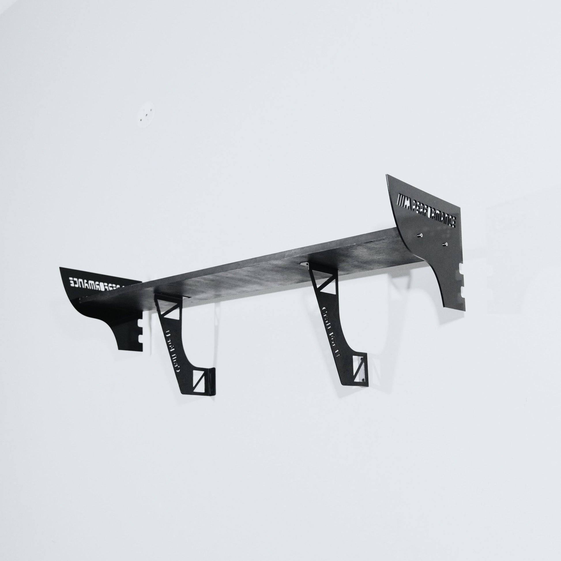 • 1 M_PERFOMANCE -Style Wall Shelf (Wood Panel + Steel Mounts with Engraved Branding + Acrylic Wings + Hardware, including L-key and bolts)